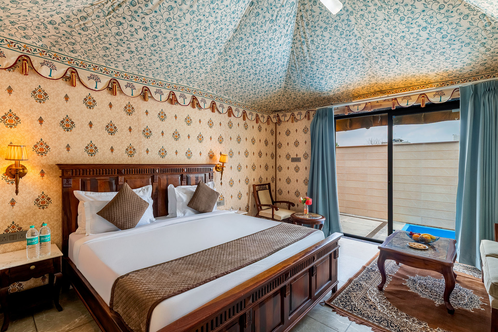 The Swiss Cottages at Fort Bijainagar provide guests with a one-of-a-kind and everlasting experience. These cottages are built to offer a traditional Rajasthani feel while having contemporary conveniences and comforts. The 300 square feet Swiss Cottages are accommodating and boast a pleasant aesthetic that is true to Rajasthani design.