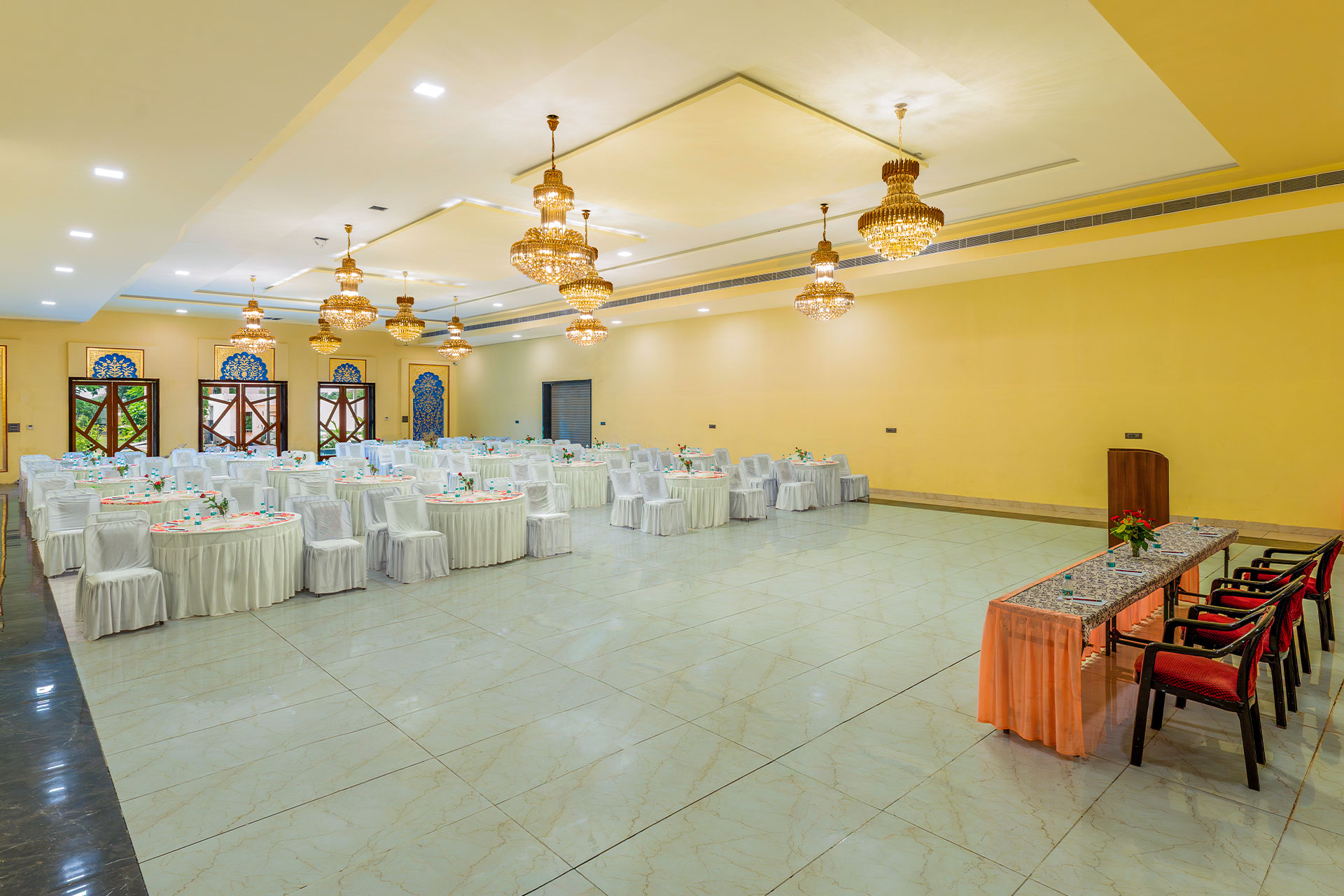For setting up your business gatherings, Fort Bijainagar's conference rooms are appropriate. These rooms, which come in sizes of 1000 square feet and 5000 square feet, are spacious with contemporary conveniences like high-speed internet, audio-visual equipment, and cosy seating configurations to ensure the success of your event.